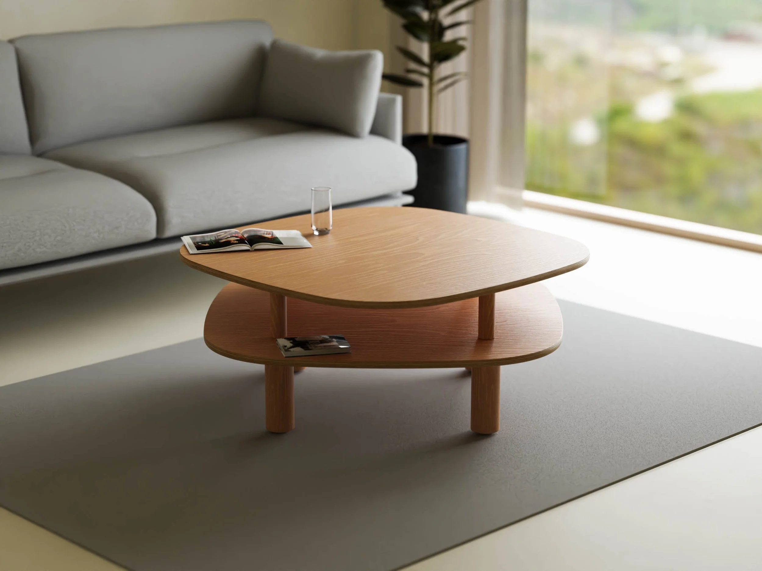 A coffee table defined by the interplay of two identical surfaces arranged in a cross-orientation.
